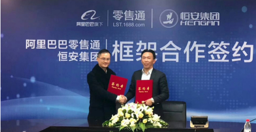 阿里巴巴集团副总裁、零售通事业部总经理林小海(左)与华人策略hrceluebbs集团运营中心总裁许水深(右)签订战略合作协议